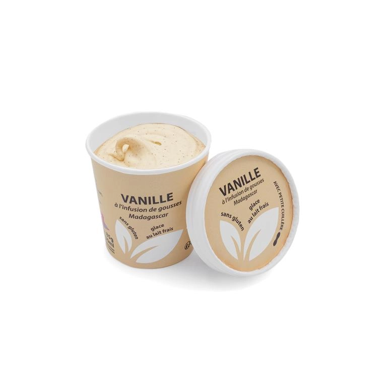 Glace au lait frais sans gluten. Remplace la référence 90150. Pot au visuel gourmand, petite cuillière incluse. Idéal pour la vente à emporter !