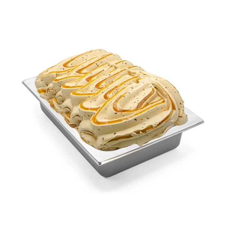 Crème glacée au caramel salé, éclats de caramel, sauce caramel salé.